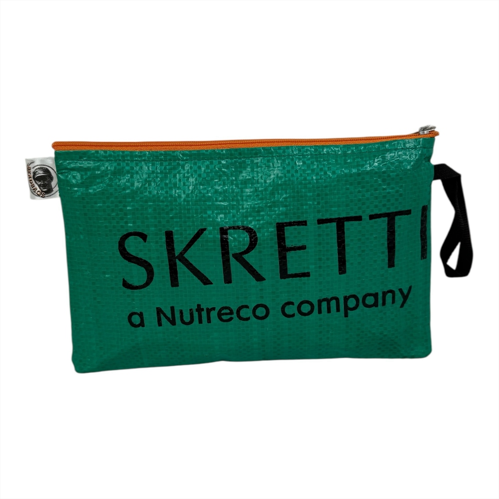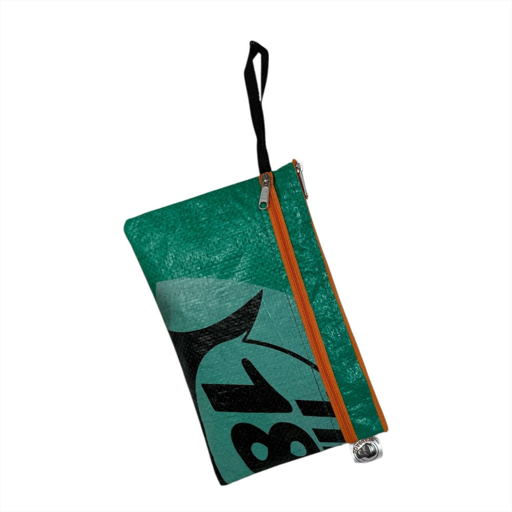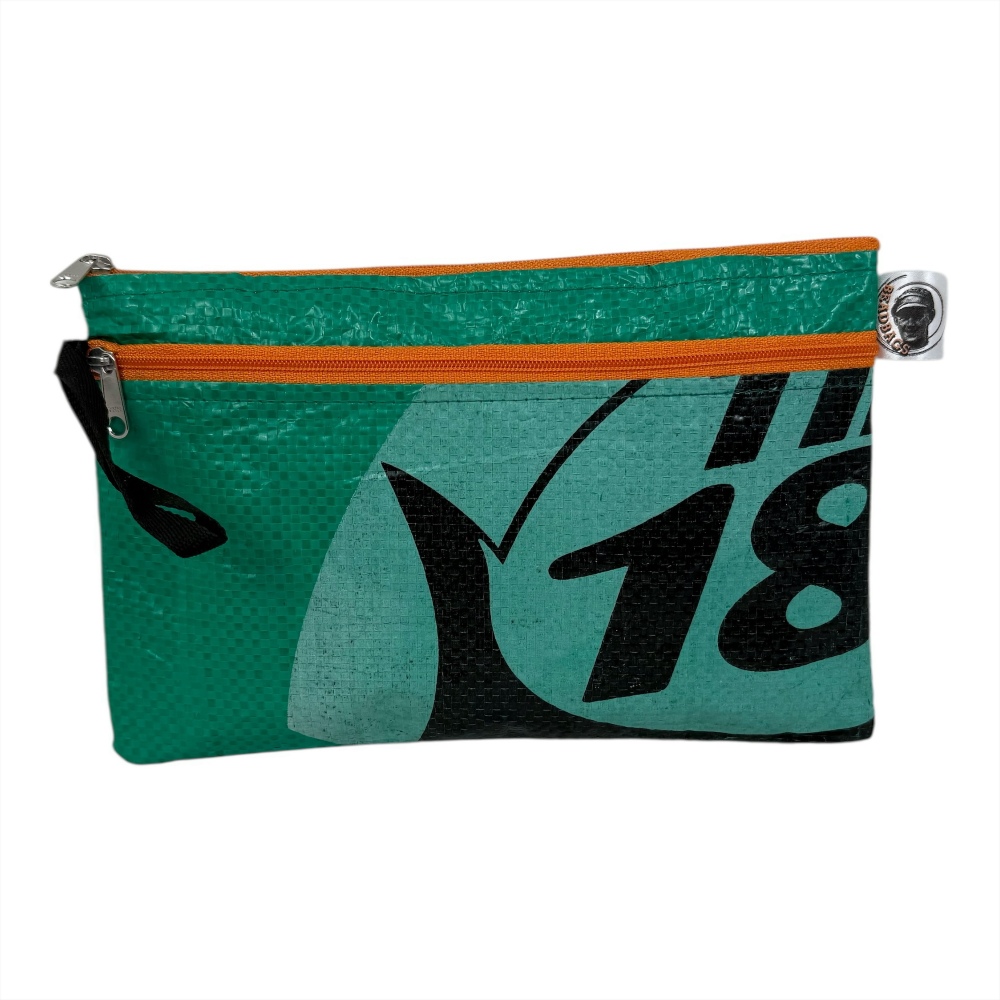 Hergestellt aus recyceltem Reissackmaterial, überzeugt die Tasche mit einem robusten, wasserabweisenden Äußeren und einem überraschend geräumigen Innenleben. Im großen Hauptfach finden Stifte, Kosmetik oder andere Utensilien mühelos Platz. Ein zusätzliches Außenfach mit Reißverschluss sorgt für schnellen Zugriff auf Kleinteile wie USB-Stick, Schlüssel oder Handy.
