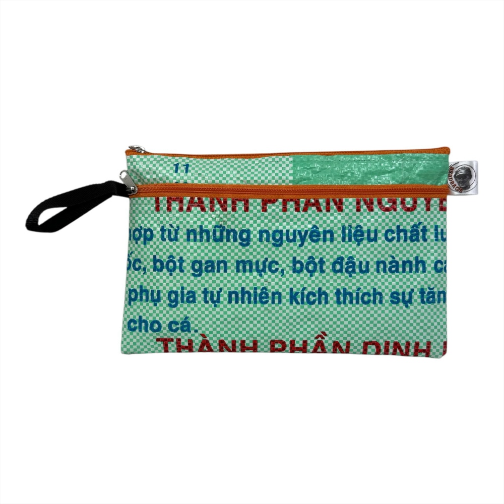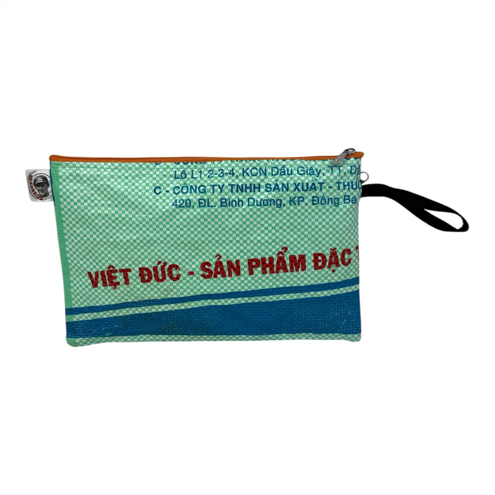 Hergestellt aus recyceltem Reissackmaterial, überzeugt die Tasche mit einem robusten, wasserabweisenden Äußeren und einem überraschend geräumigen Innenleben. Im großen Hauptfach finden Stifte, Kosmetik oder andere Utensilien mühelos Platz. Ein zusätzliches Außenfach mit Reißverschluss sorgt für schnellen Zugriff auf Kleinteile wie USB-Stick, Schlüssel oder Handy.