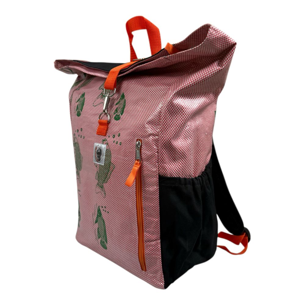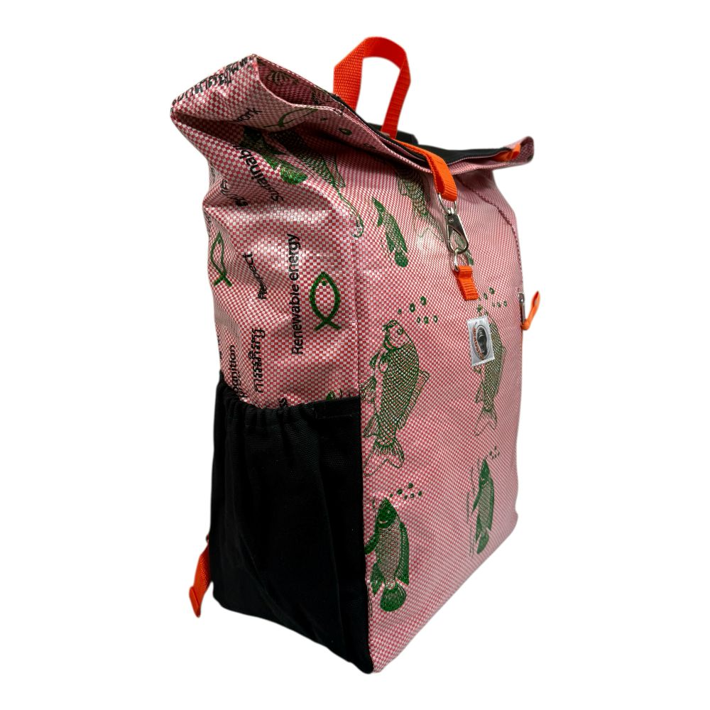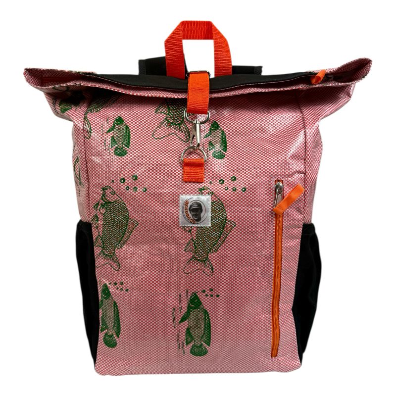 Der sportliche, trendige, geräumige Rolltop Rucksack garantiert fair hergestellt. Für die City, zum Wandern, Radfahren und andere Abenteuer. Er ist ein echtes Platzwunder und hält durch die tropenerprobten Materialien schwere Lasten. Durch das wasserundurchlässige Material ist er auch bei Wind und Wetter der optimale Begleiter. Der Rolltop Rucksack sticht durch seine Größe hervor. Für zwei kleine Trinkflasche befindet sich außen am Rucksack zwei Einstecktaschen. Zusätzlich hat er ein vertikales Außenfach mit Reißverschluss. Das Innenleben überzeugt bei diesem Rolltop Rucksack ebenfalls. Einfach und praktisch mit einem Fach für das Tablet sowie einem kleinen Reißverschlussfach. Wissenswertes: Nicht nur das Aussehen und das Funktionale überzeugen, sondern auch der Fakt, dass der Rucksack zu 100% aus recycelten Materialien von Hand produziert ist. Die Produktion findet unter den strengen Auflagen der World Fair Trade Organisation in Kambodscha statt. Unser Upcycling Rucksack unterstützt langfristige die Schonung der Umwelt und sichert Menschen in Kambodscha das Überleben. Wir arbeiten mit recycelten Reis-bzw. Zementsäcken. Unsere nachhaltigen Accessoires sind extrem widerstandsfähig, leicht, abwaschbar und halten hohe Lasten aus. Nachhaltig, funktional, tropentauglich und herzerfüllt!