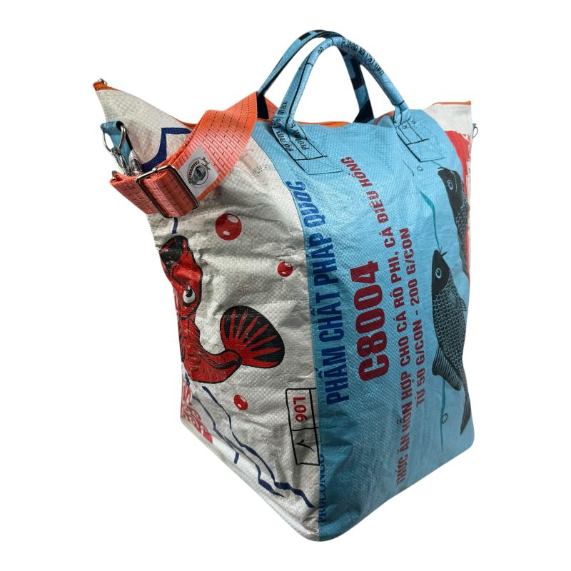 Hergestellt aus 100% recyceltem Material wie Reissack-, Zementsack- und Moskitonetzstoffen. Der orangene Gurt war früher ein Schiffscontainerspanngurt im Hamburger Hafen. Heute trägt er Verantwortung für Umwelt und Menschen.