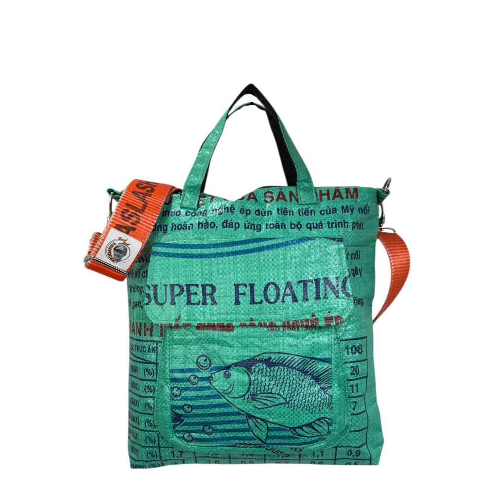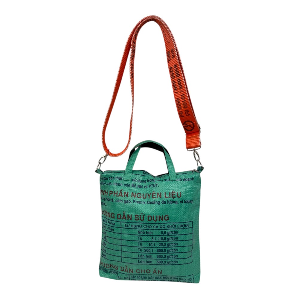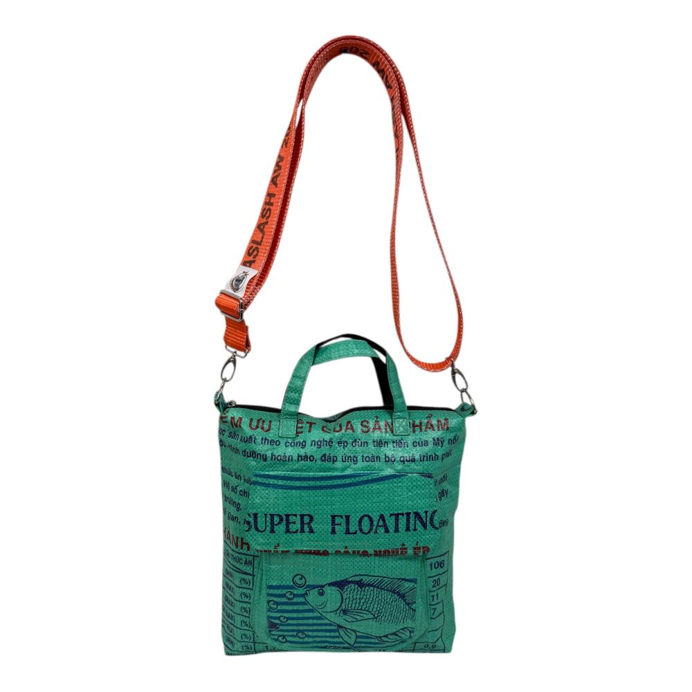 Gefertigt aus recyceltem Reissackmaterial in einem kraftvollen Orange und ausgestattet mit einem robusten Tampenjan-Tragegurt aus Hochseespannmaterial, überzeugt sie durch Stil, Funktionalität und Umweltbewusstsein.