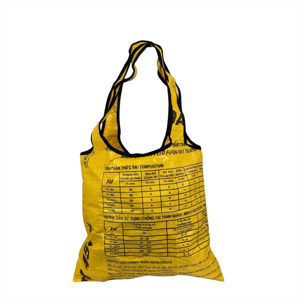 Jede Tasche wird 100 % von Hand gefertigt – aus recyceltem Reissackmaterial – und ist damit ein absolutes Unikat. Muster, Farben und Schriftzüge variieren und machen jede Tasche zu deinem persönlichen Einzelstück.