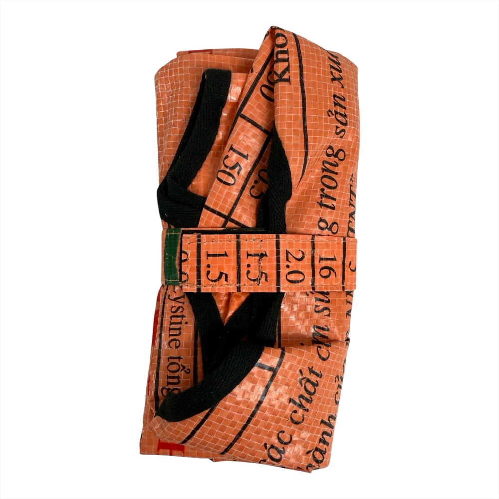 Jede Tasche wird 100 % von Hand gefertigt – aus recyceltem Reissackmaterial – und ist damit ein absolutes Unikat. Muster, Farben und Schriftzüge variieren und machen jede Tasche zu deinem persönlichen Einzelstück.